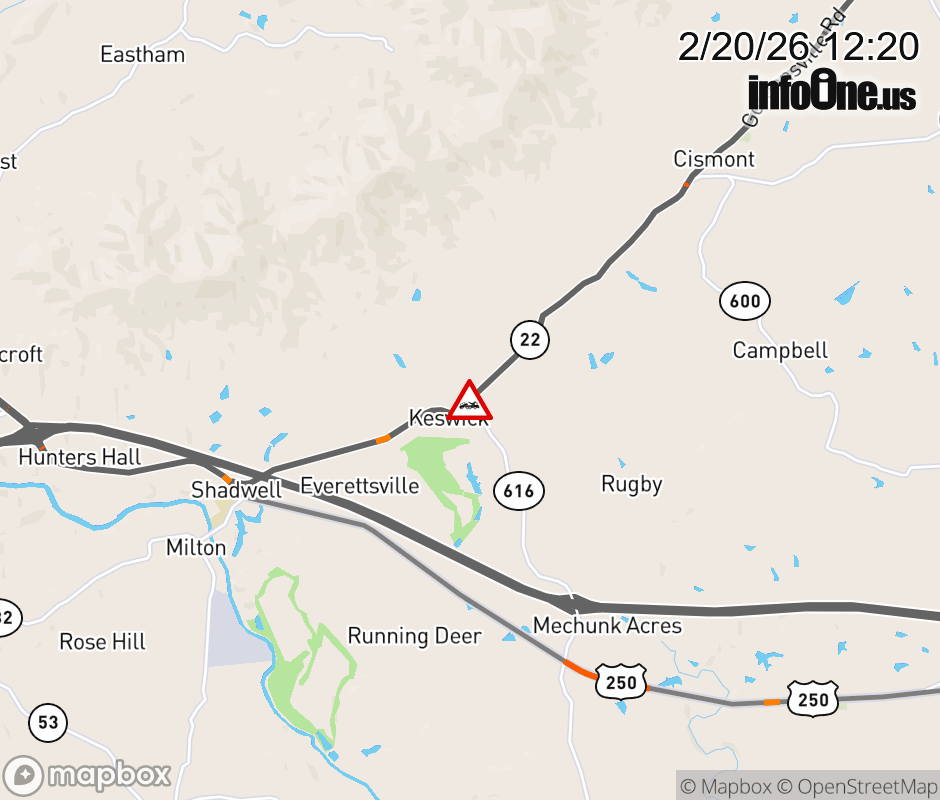 On VA-22 in the County of Albemarle, in the vicinity of Black Cat Rd; Rt. 616N/S (Albemarle County), motorists can expect delays due to a disabled vehicle. All east lanes are closed. All west lanes are closed. ![]() |