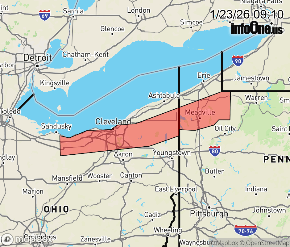 Canceled 1/23/26 10:00 AM Special Weather Statement issued January 23 at 9:09AM EST by NWS Cleveland OH At 905 AM EST, radar indicated snow showers along a line extending from 7 miles northwest of Orwell to Cleveland to near Union City, moving southeast at 10 mph. HAZARDS INCLUDE... Winds to 30 mph... Visibility dropping to less than a half mile... A quick coating of snow on roadways... Locations impacted include... Cleveland, Elyria, Norwalk, Meadville, Western Vermilion, Vermilion, Chardon, Parma, Lakewood, Euclid, Cleveland Heights, Strongsville, Brunswick, Westlake, North Royalton, North Ridgeville, Solon, Avon Lake, and Hudson. Use extra caution if you must travel. Rapid changes in visibility and potentially slick roads may lead to accidents. ![]() |