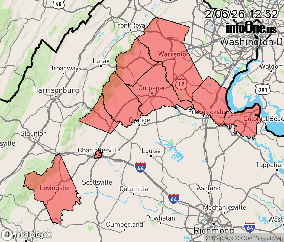 Canceled 2/6/26 3:59 PM Cold Weather Advisory issued February 6 at 12:51PM EST until February 8 at 10:00AM EST by NWS Baltimore MD/Washington DC * WHAT... For the Cold Weather Advisory, very cold wind chills as low as 8 degrees below zero expected. For the Wind Advisory, northwest winds 20 to 30 mph with gusts up to 55 mph expected. * WHERE... Albemarle, Greene, King George, Nelson, Culpeper, Southern Fauquier, Stafford, Madison, and Rappahannock Counties. * WHEN... For the Cold Weather Advisory, from 4 AM Saturday to 10 AM EST Sunday. For the Wind Advisory, from 4 AM to 7 PM EST Saturday. * IMPACTS... Gusty winds will blow around unsecured objects. Tree limbs could be blown down and a few power outages may result. The cold wind chills as low as 10 below zero could result in hypothermia if precautions are not taken. * ADDITIONAL DETAILS... Wind chills will remain at or below zero during the day on Saturday due to windy conditions and cold temperatures. ![]() |