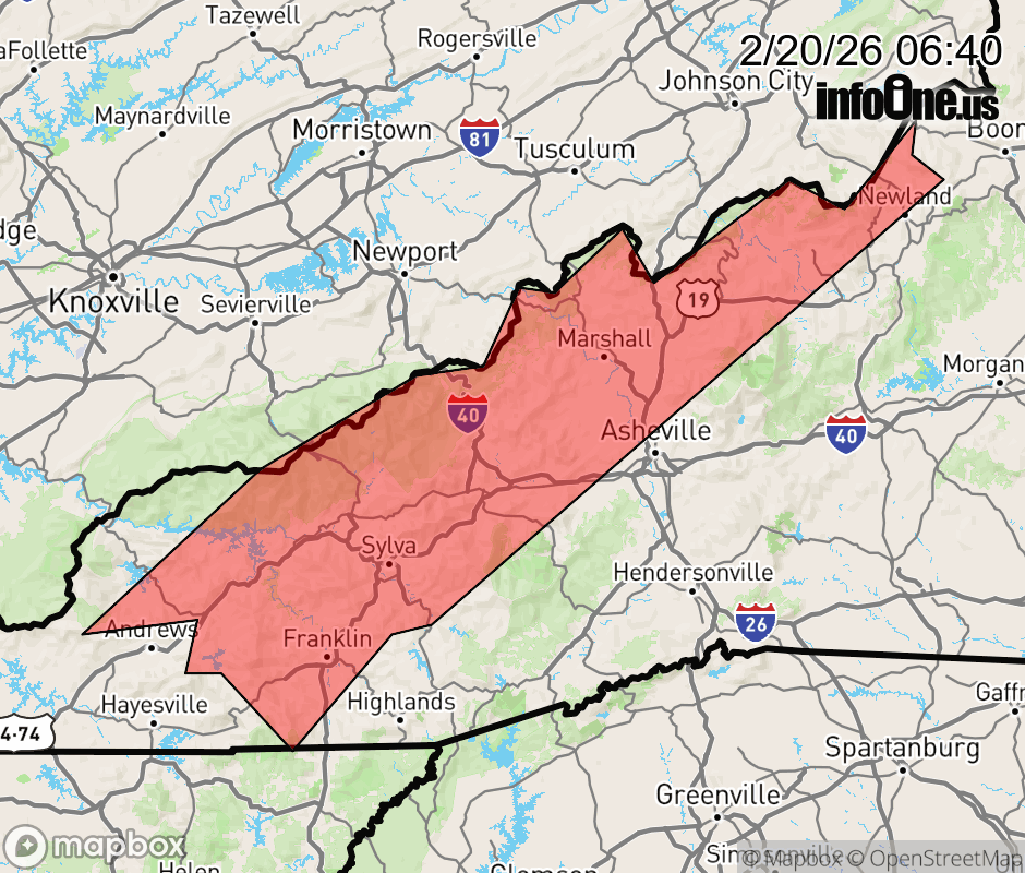 Canceled 2/20/26 7:45 AM Special Weather Statement issued February 20 at 6:39AM EST by NWS Greenville-Spartanburg SC At 637 AM EST, Doppler radar was tracking gusty showers along a line extending from 7 miles west of Johnson City to 8 miles west of Murphy. A few thunderstorms were embedded with this this line. Movement was east at 50 mph. HAZARD...Wind gusts up to 50 mph. SOURCE...Radar indicated. IMPACT...Gusty winds could knock down tree limbs and blow around unsecured objects. Locations impacted include... Franklin, Sylva, Waynesville, Burnsville, Bryson City, Marshall, Robbinsville, Newland, Cherokee, and Woodfin. ![]() |