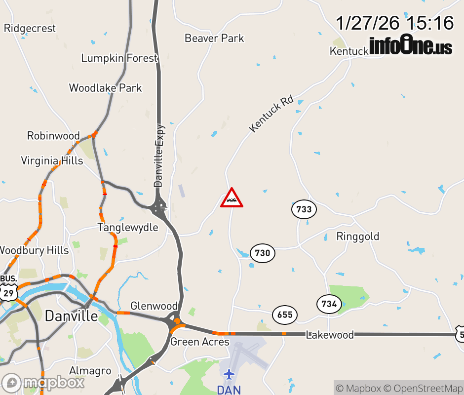 On Rt. 732 in the County of Pittsylvania, in the vicinity of Kentuck Rd; Rt. 729N/S (Pittsylvania County), motorists can expect delays due to a disabled tractor trailer. All east lanes are closed. All west lanes are closed. Updated: Tue 1/27/26 3:16 PM EST ![]() Updated: Tue 1/27/26 3:16 PM EST |