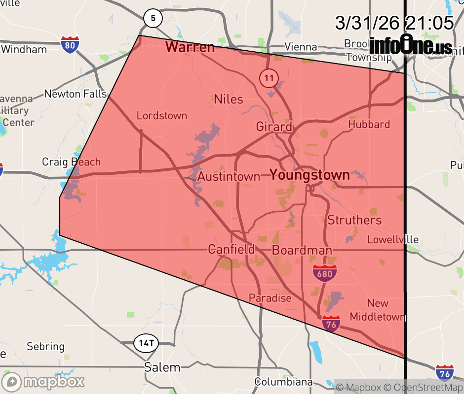 Canceled 3/31/26 9:30 PM Severe Thunderstorm Warning issued March 31 at 9:04PM EDT until March 31 at 9:30PM EDT by NWS Cleveland OH At 903 PM EDT, a severe thunderstorm was located near Hilltop, or 7 miles south of Warren, moving east at 50 mph. HAZARD...60 mph wind gusts and quarter size hail. SOURCE...Radar indicated. IMPACT...Minor damage to vehicles is possible. Expect damage to trees and power lines. Locations impacted include... Youngstown, Warren, Boardman, Niles, Campbell, Hubbard, Canfield, Lordstown, Hilltop, Maplewood Park, Leavittsburg, Austintown, Struthers, Girard, McDonald, Poland, Ellsworth, New Middletown, Craig Beach, and Lowellville. ![]() |