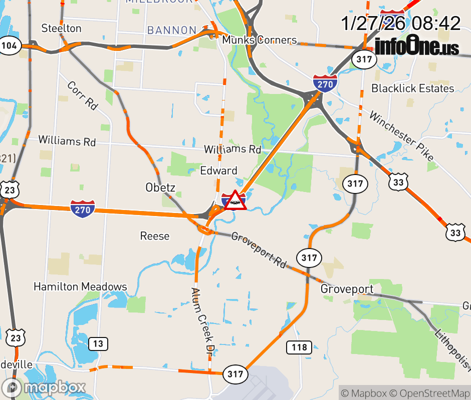 The left lane is blocked on I-270 South at Alum Creek Dr, due to a crash. Updated: Tue 1/27/26 8:42 AM EST ![]() Updated: Tue 1/27/26 8:42 AM EST |