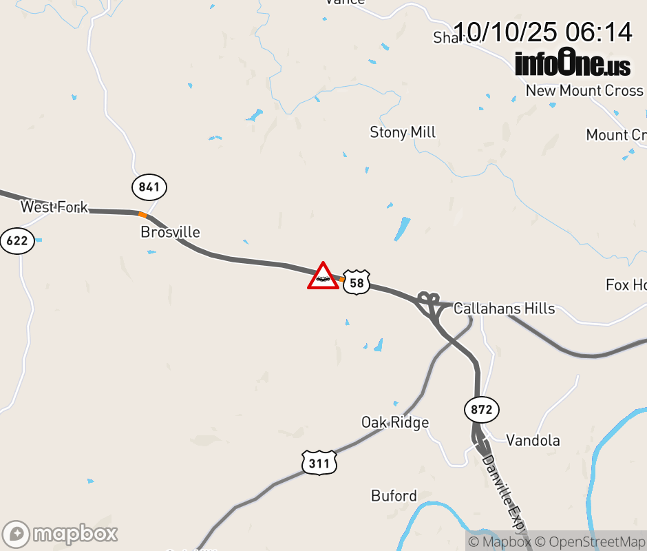 On US-58 in the County of Pittsylvania, in the vicinity of Breezewood Dr; Rt. 869N/S (Pittsylvania County), motorists can expect delays due to a vehicle crash. All east lanes are closed. ![]() |