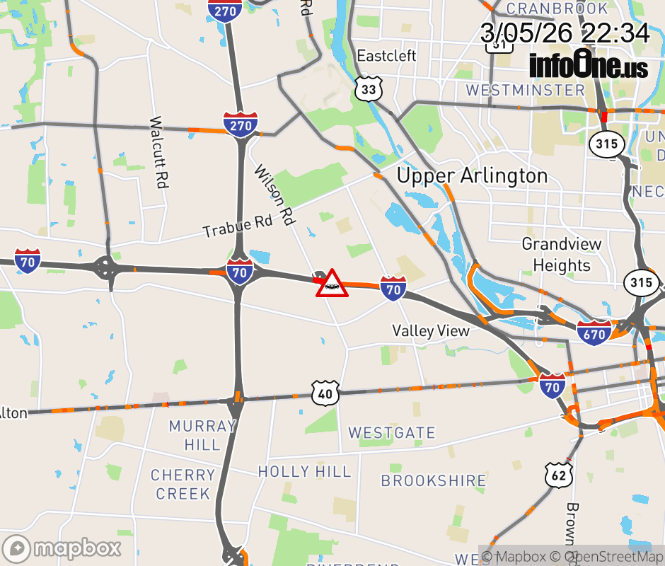 The 2 left lanes are blocked on I-70 West at Wilson Rd, due to a crash. Updated: Thu 3/5/26 10:34 PM EST ![]() Updated: Thu 3/5/26 10:34 PM EST |