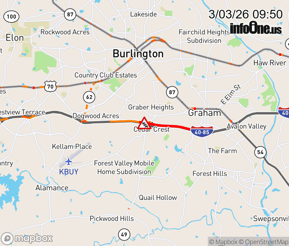 The right lane is closed near Exit 145 (NC 49/Maple Ave). Updated: Tue 3/3/26 9:50 AM EST ![]() Updated: Tue 3/3/26 9:50 AM EST |
