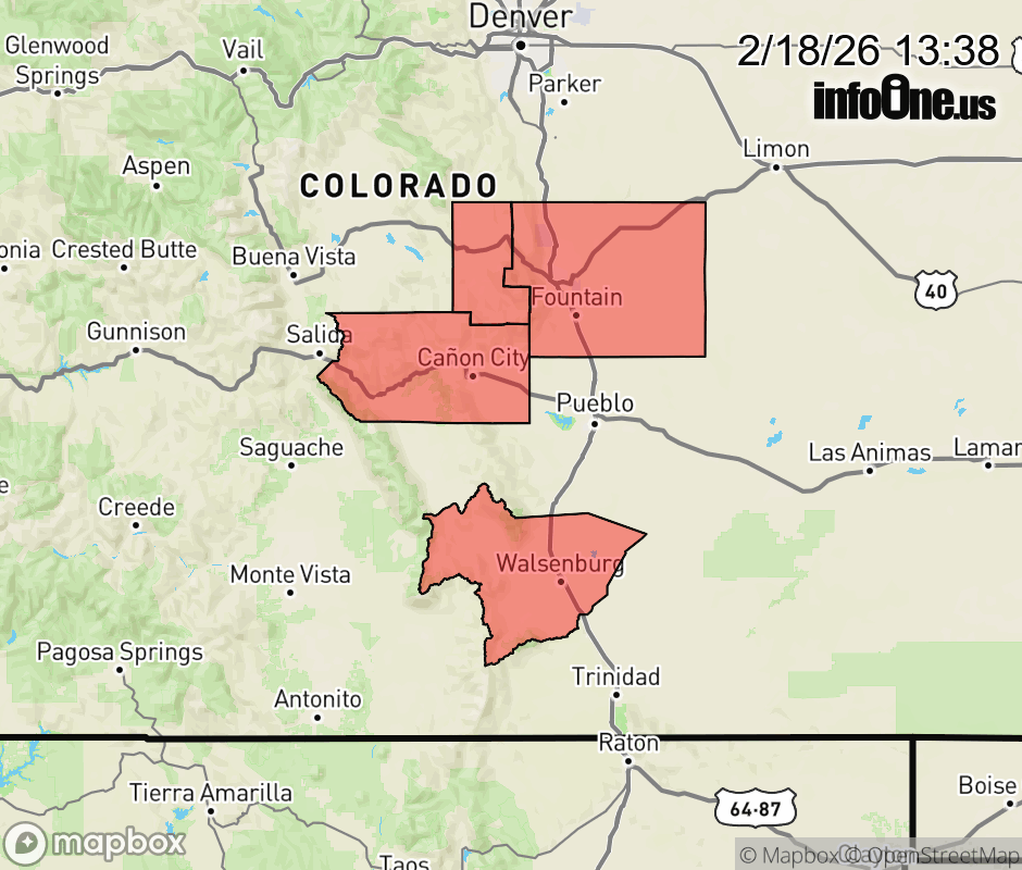 Canceled 2/18/26 9:03 PM Red Flag Warning issued February 18 at 11:36AM MST until February 19 at 7:00PM MST by NWS Pueblo CO The National Weather Service in Pueblo has issued a Red Flag Warning for gusty winds and low relative humidity, which is in effect from 10 AM to 7 PM MST Thursday. The Fire Weather Watch is no longer in effect. * AFFECTED AREA... Fire Weather Zones 222 and 229. * WINDS... West 20 to 30 mph with gusts up to 45 mph. * RELATIVE HUMIDITY... As low as 13 percent. * IMPACTS... Fires will catch and spread quickly. Exercise extreme caution and avoid activities which could start a wildfire. ![]() |
