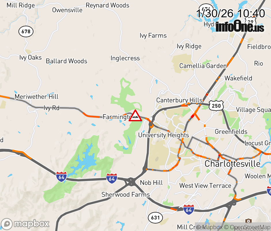 On US-250 in the County of Albemarle, in the vicinity of Ivy Rd; US-250E, motorists can expect delays due to a disabled vehicle. All west lanes are closed. ![]() |
