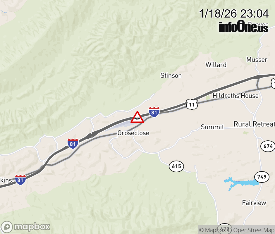 On I-81 at mile marker 56.4 in the County of Smyth, motorists can expect delays due to a vehicle crash. The north left shoulder and left lane are closed. The south right shoulder is closed. Updated: Sun 1/18/26 11:04 PM EST ![]() Updated: Sun 1/18/26 11:04 PM EST |