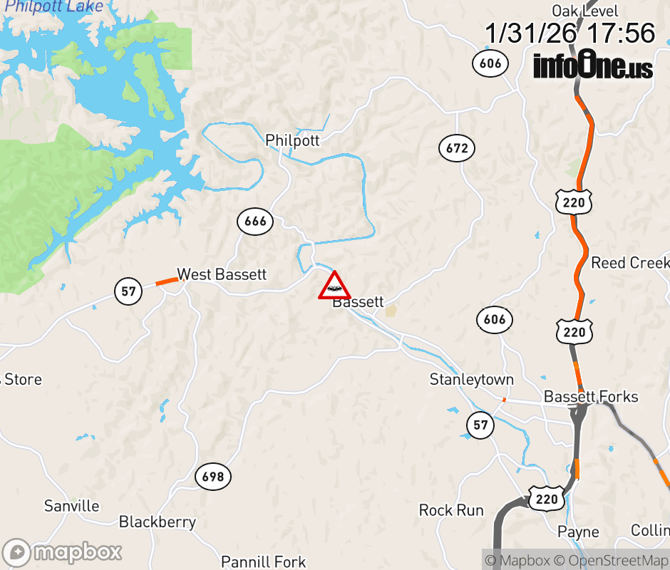 On ALT VA-57 East in the County of Henry, in the vicinity of the ramp at William F. Stone Highway, motorists can expect delays due to a vehicle crash. Lane closures exist. ![]() |