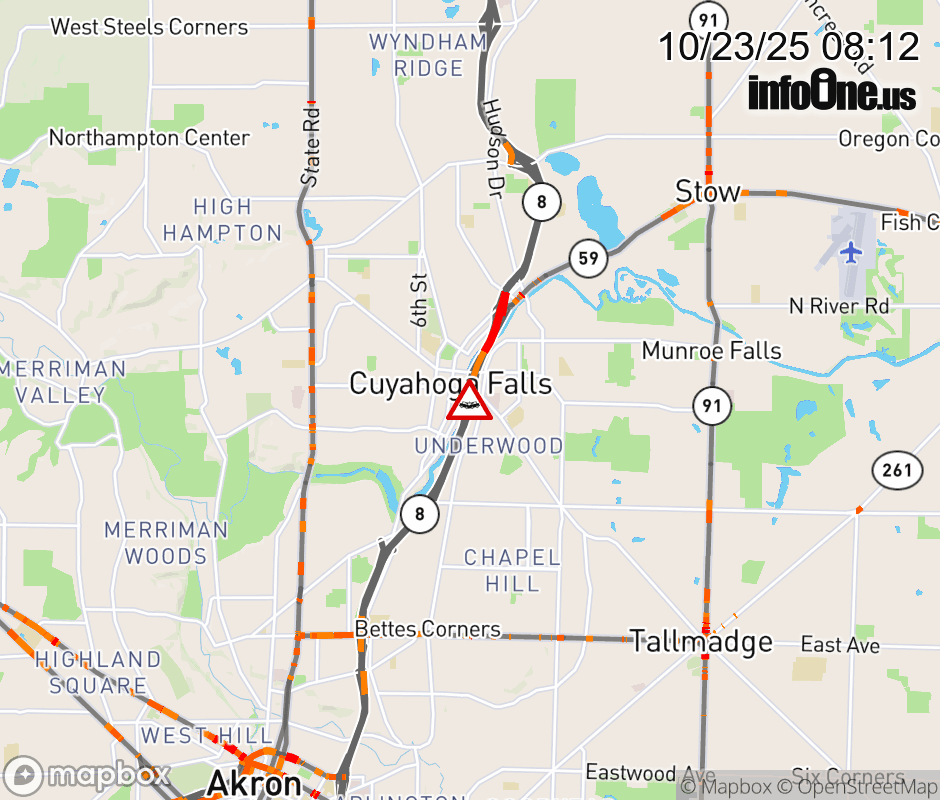 The right lane is blocked on SR-8 North/SR-59 East at Portage Trail, due to a crash. Updated: Thu 10/23/25 8:12 AM EDT ![]() Updated: Thu 10/23/25 8:12 AM EDT |