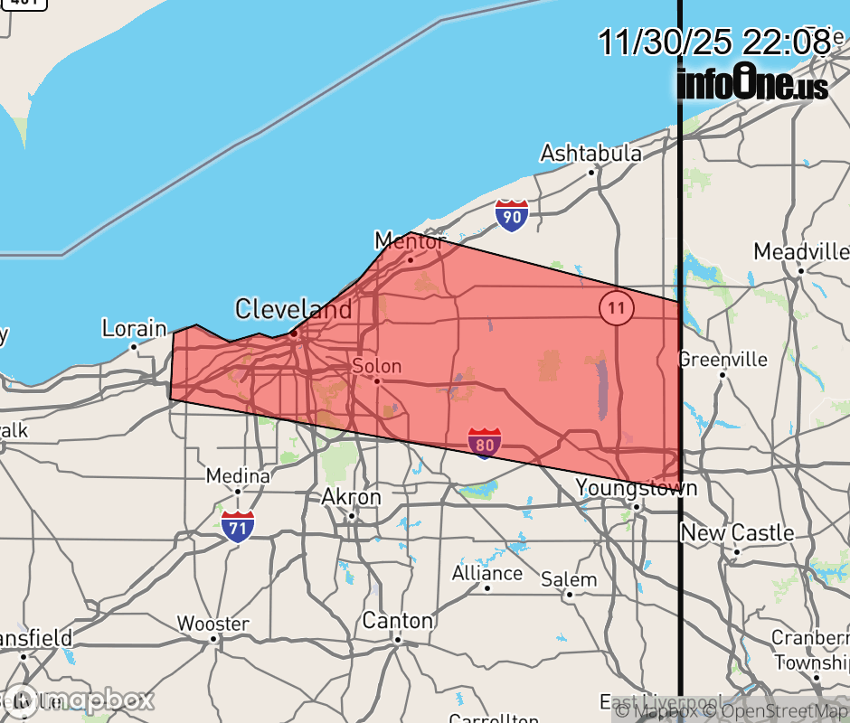 Canceled 11/30/25 11:00 PM Special Weather Statement issued November 30 at 10:06PM EST by NWS Cleveland OH At 1006 PM EST, radar indicated an intense lake effect snow band along a line extending from 9 miles north of Lakewood to near North Bloomfield, moving southeast at 30 mph. HAZARDS INCLUDE... Visibility rapidly dropping to less than a quarter of a mile... Up to 1 inch of quick snow accumulation... Locations impacted include... Cleveland, Warren, Painesville, Willowick, Chardon, Parma, Lakewood, Euclid, Mentor, Cleveland Heights, Strongsville, Westlake, North Royalton, North Ridgeville, Solon, Avon Lake, Willoughby, Hudson, Niles, and Twinsburg. Use extra caution if you must travel into or through this lake effect snow band. Rapid changes in visibility and potentially slick roads are likely to lead to accidents. Consider delaying travel until this snow band passes your location. ![]() |