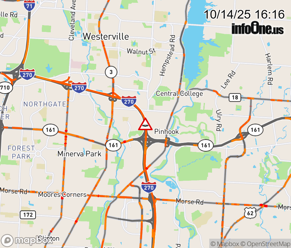 The 2 center lanes are blocked on I-270 North beyond SR-161, due to a crash. ![]() |