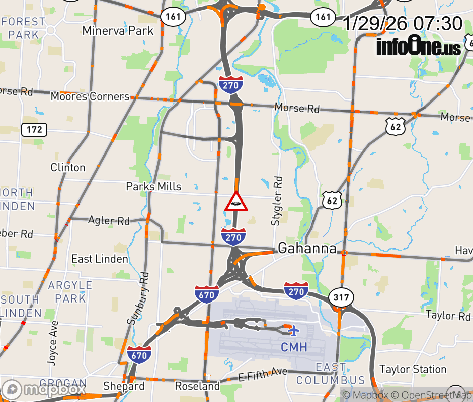 The left lane is blocked on I-270 North beyond US-62 East/Johnstown Rd, due to a crash. ![]() |