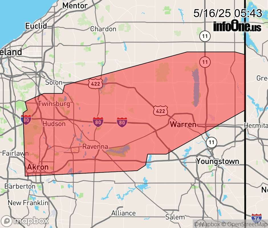 Canceled 5/16/25 6:30 AM Special Weather Statement issued May 16 at 5:42AM EDT by NWS Cleveland OH At 542 AM EDT, Doppler radar was tracking a strong thunderstorm near West Farmington, or 9 miles northwest of Warren, moving northeast at 45 mph. HAZARD...Wind gusts up to 50 mph and half inch hail. SOURCE...Radar indicated. IMPACT...Gusty winds could knock down tree limbs and blow around unsecured objects. Minor hail damage to vegetation is possible. Locations impacted include... Akron, Warren, Ravenna, Cuyahoga Falls, Kent, Solon, Hudson, Niles, Twinsburg, Tallmadge, Streetsboro, Macedonia, Cortland, Newton Falls, Mogadore, Lordstown, Middlefield, Garrettsville, Kinsman, and North Bloomfield. ![]() |