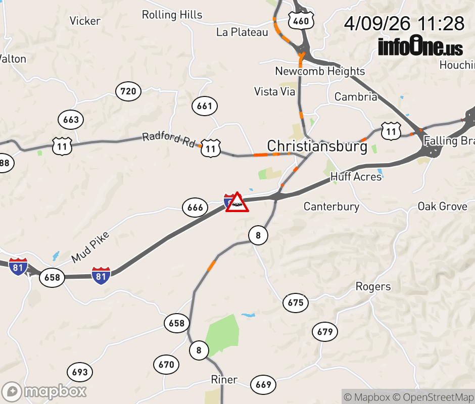 On I-81 at mile marker 113.6 in the County of Montgomery, motorists can expect delays due to a vehicle crash. The north right shoulder is closed. ![]() |