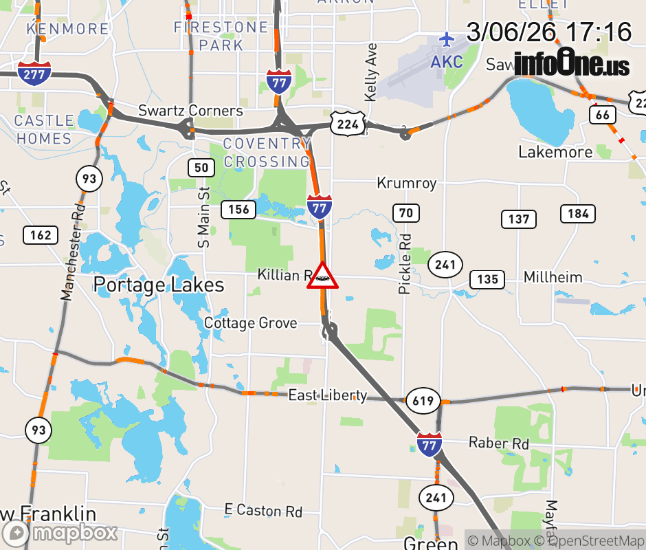 The right lane is blocked on I-77 South beyond US-224 East, due to a crash. Updated: Fri 3/6/26 5:16 PM EST ![]() Updated: Fri 3/6/26 5:16 PM EST |