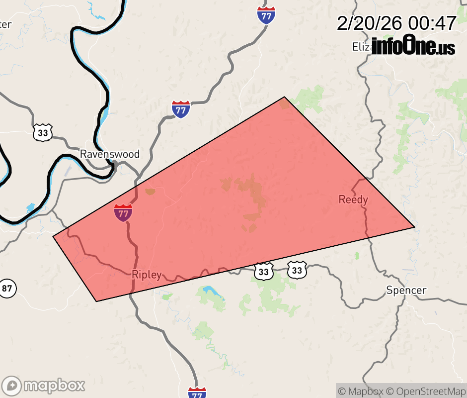 Canceled 2/20/26 12:55 AM Tornado Warning issued February 20 at 12:46AM EST until February 20 at 1:00AM EST by NWS Charleston WV TORRLX The National Weather Service in Charleston West Virginia has issued a * Tornado Warning for... Southwestern Wirt County in northwestern West Virginia... Northwestern Roane County in central West Virginia... Central Jackson County in northwestern West Virginia... * Until 100 AM EST. * At 1245 AM EST, a severe thunderstorm capable of producing a tornado was located near Ripley, moving east at 45 mph. HAZARD...Tornado and quarter size hail. SOURCE...Radar indicated rotation. IMPACT...Flying debris will be dangerous to those caught without shelter. Mobile homes will be damaged or destroyed. Damage to roofs, windows, and vehicles will occur. Tree damage is likely. * This dangerous storm will be near... Ripley and Sandyville around 1250 AM EST. Other locations impacted by this tornadic thunderstorm include Cottageville, Leroy, Peewee, Reedy, and Evans. ![]() |
