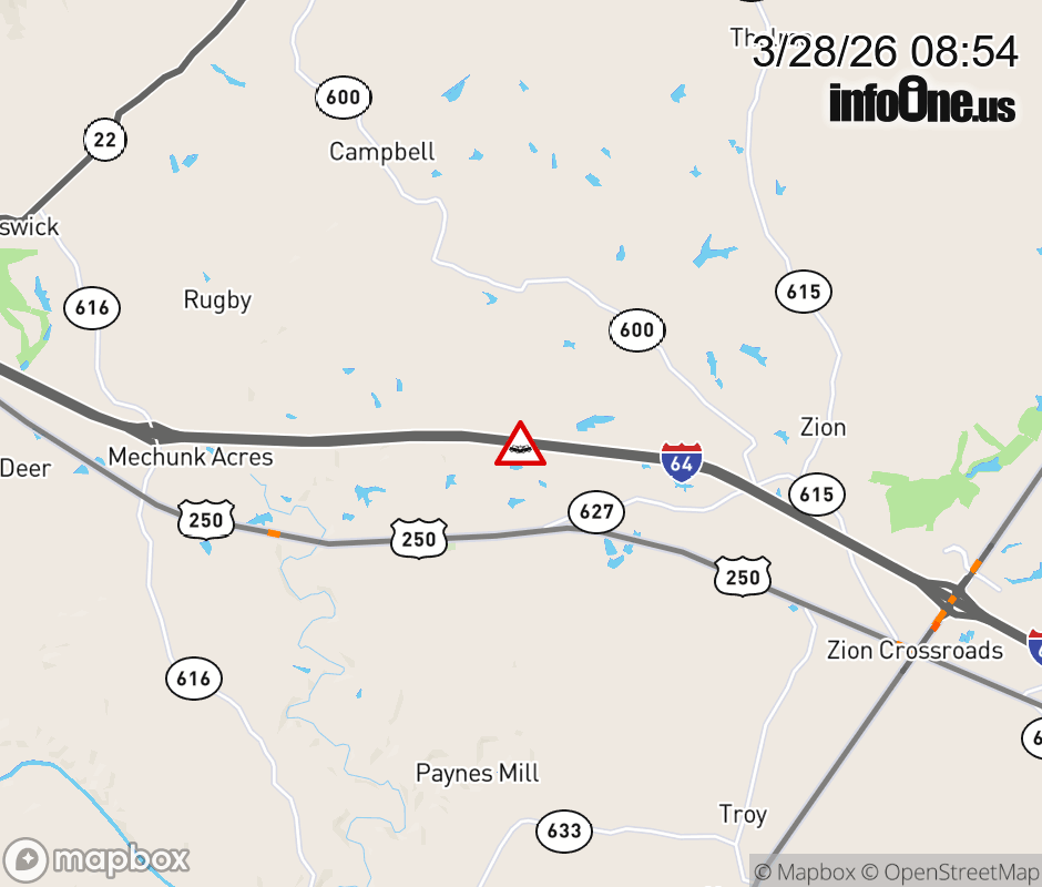 On I-64 at mile marker 133 in the County of Louisa, motorists can expect delays due to a vehicle crash. The east right shoulder is closed. Updated: Sat 3/28/26 8:54 AM EDT ![]() |