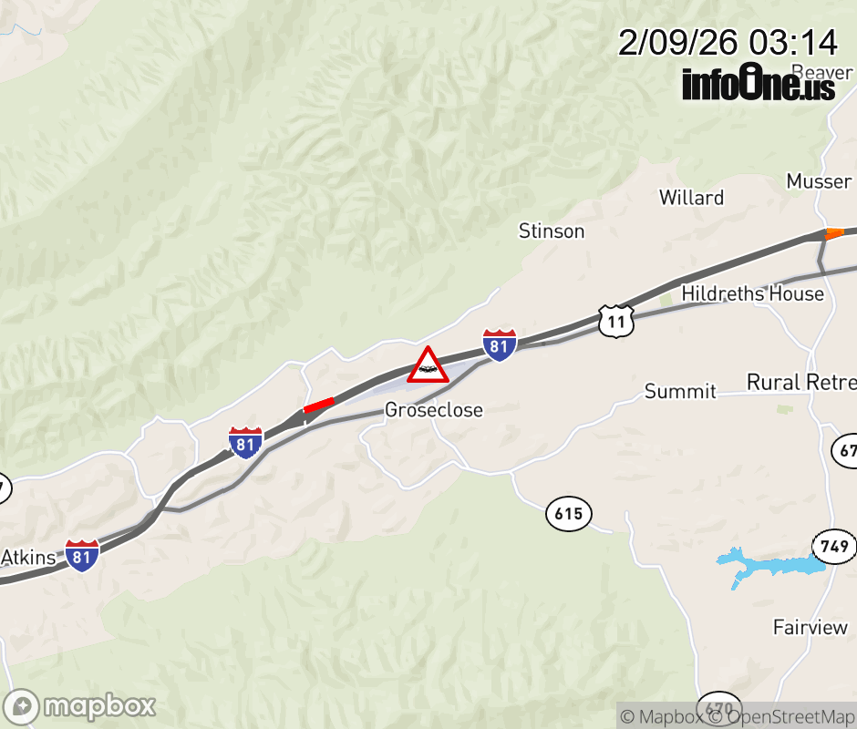 On I-81 at mile marker 56.2 in the County of Smyth, motorists can expect delays due to a vehicle crash. The north left shoulder and left lane are closed. Updated: Mon 2/9/26 3:14 AM EST ![]() Updated: Mon 2/9/26 3:14 AM EST |