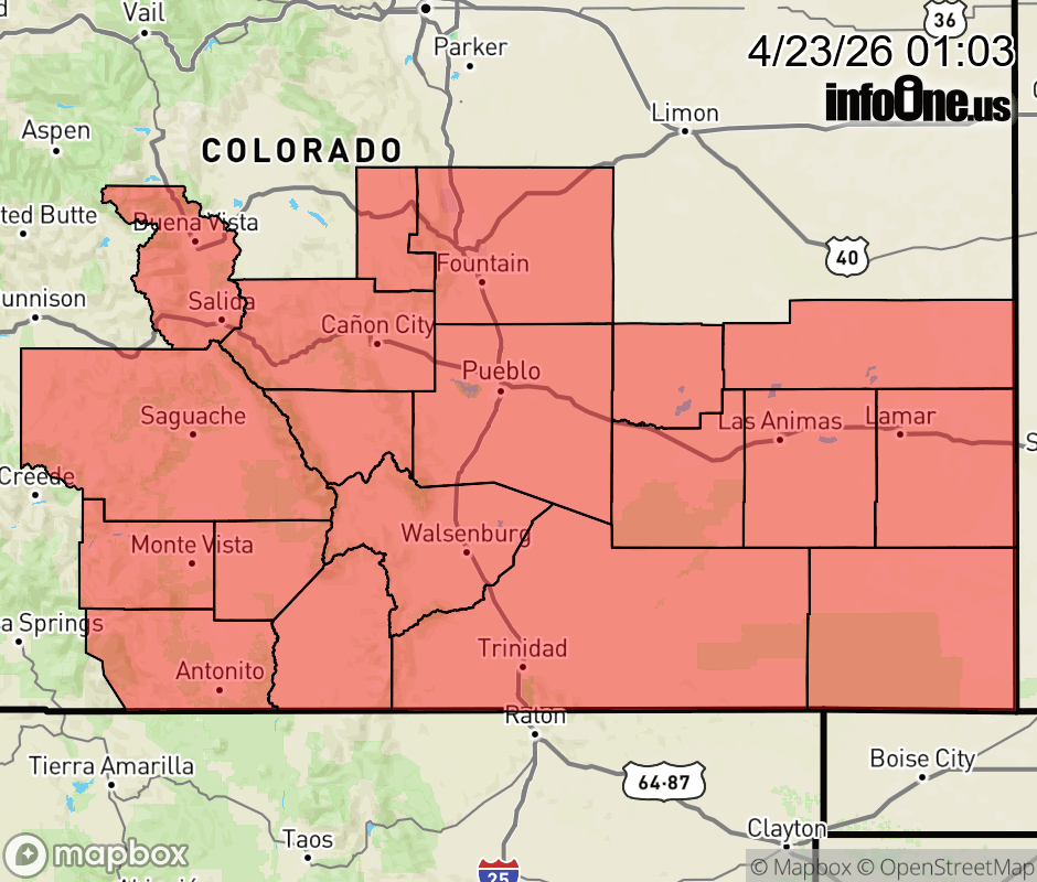 Canceled 4/23/26 3:39 AM Red Flag Warning issued April 22 at 11:02PM MDT until April 23 at 9:00PM MDT by NWS Pueblo CO The National Weather Service in Pueblo has issued a Fire Weather Watch for gusty winds and low relative humidity, which is in effect from Friday morning through Friday evening. The Red Flag Warning for this evening has been cancelled. * AFFECTED AREA... Fire Weather Zones 221, 222, 224, 225, 226, 227, 228, 229, 230, 231, 232, 233, 234, 235, 236 and 237. * TIMING... For the Red Flag Warning, from 11 AM to 9 PM MDT Thursday. For the Fire Weather Watch, from Friday morning through Friday evening. * WINDS... West 15 to 25 mph with gusts up to 45 mph. * RELATIVE HUMIDITY... As low as 7 percent. * IMPACTS... Elevated fire danger is expected. Fires will catch and spread rapidly and erratically. ![]() |