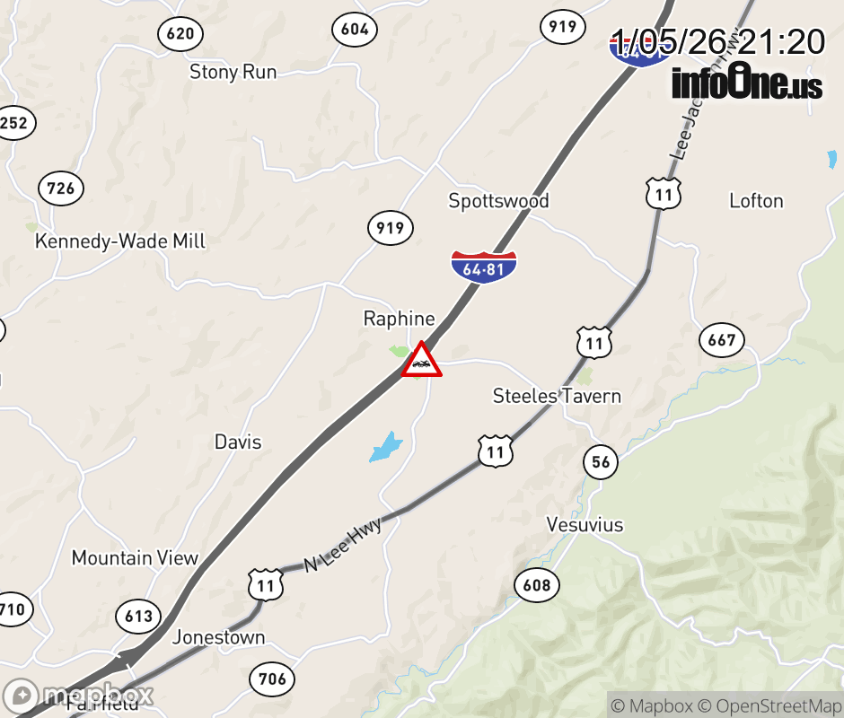 On Rt. 606 in the County of Rockbridge, in the vicinity of the ramp from and to I-81N, motorists can expect delays due to a disabled tractor trailer. All east lanes are closed. ![]() |