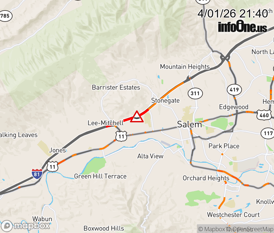 On I-81 at mile marker 138 in the County of Roanoke, motorists can expect delays due to a vehicle crash. The north left shoulder and left lane are closed. ![]() |
