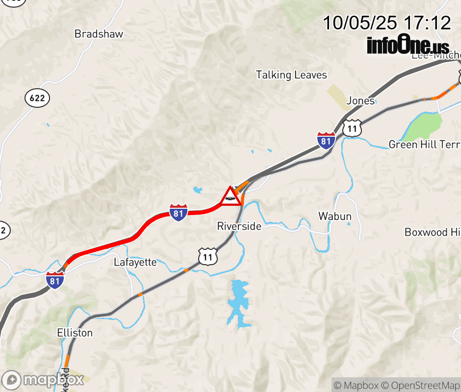 On I-81 at mile marker 132 in the County of Roanoke, motorists can expect delays due to a tractor trailer crash. The north right shoulder is closed. Traffic backups are approximately 1.5 miles. Updated: Sun 10/5/25 5:12 PM EDT ![]() Updated: Sun 10/5/25 5:12 PM EDT |