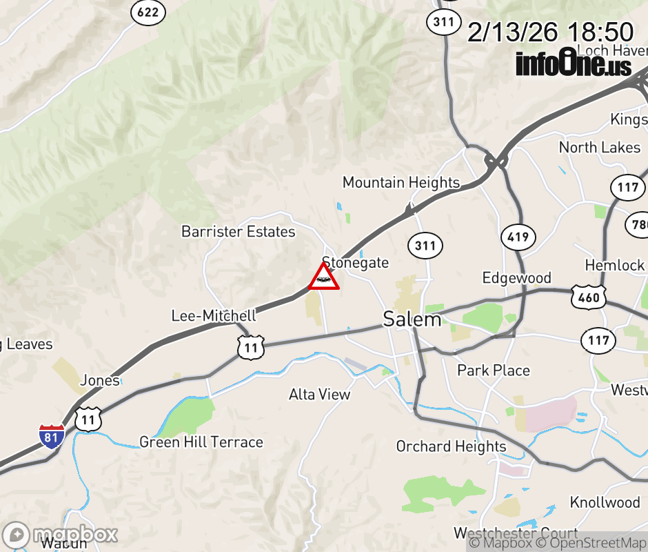 On I-81 at mile marker 138.6 in the County of Roanoke, motorists can expect delays due to a vehicle crash. The north left shoulder is closed. ![]() |