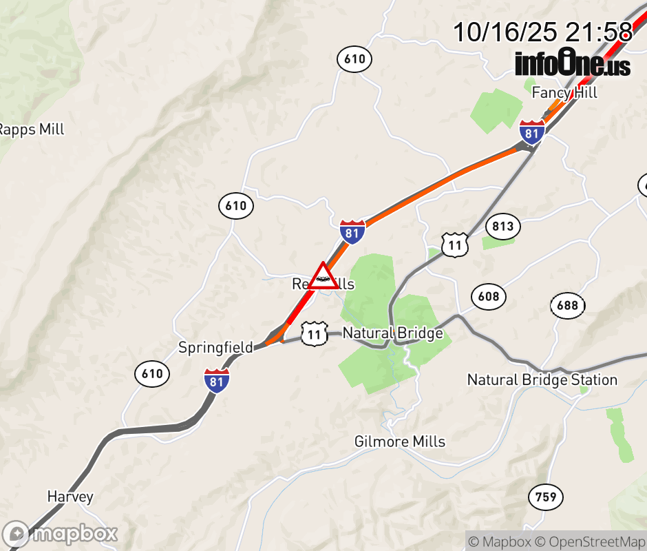 On I-81 North at mile marker 177 in the County of Rockbridge, motorists can expect delays due to a multi-vehicle crash. Traffic backups are approximately 1.5 miles. Updated: Thu 10/16/25 9:58 PM EDT ![]() Updated: Thu 10/16/25 9:58 PM EDT |