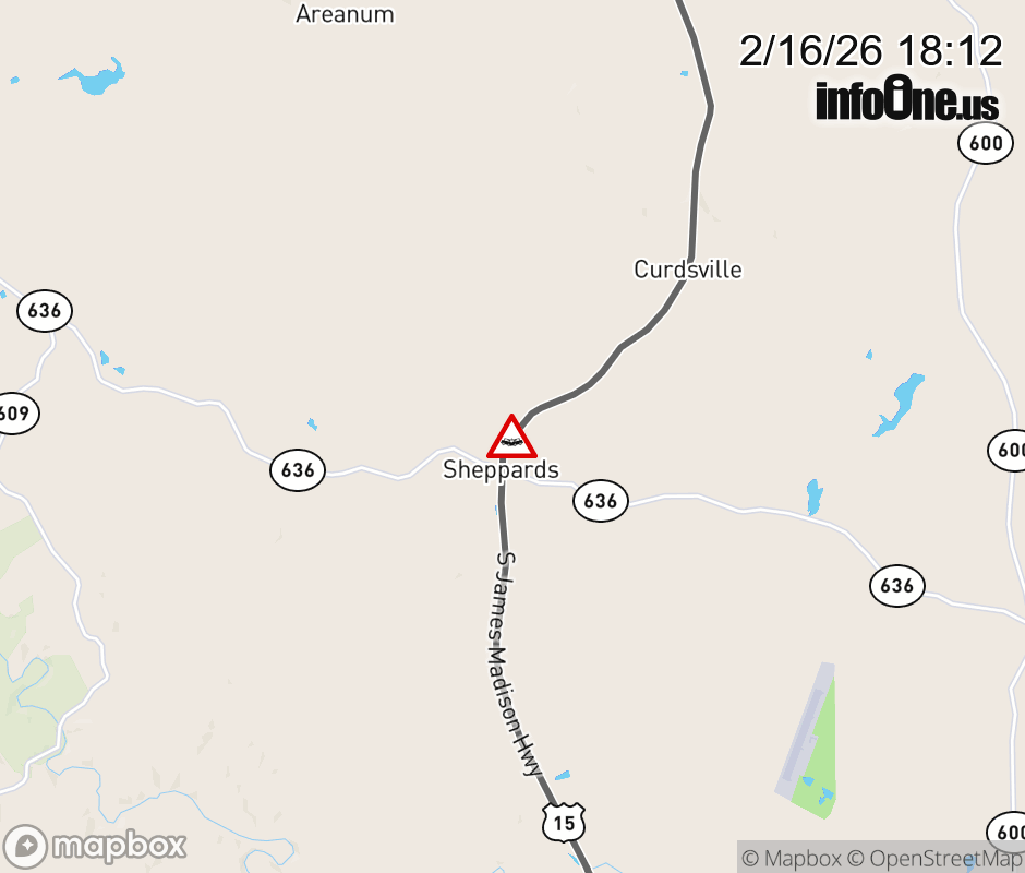 On US-15 North in the County of Buckingham, in the vicinity of Holland Rd; Rt. 709N/S (Buckingham County), motorists can expect delays due to a vehicle crash. Lane closures exist. ![]() |