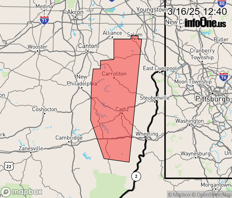 Canceled 3/16/25 12:48 PM Severe Thunderstorm Warning issued March 16 at 12:39PM EDT until March 16 at 1:15PM EDT by NWS Pittsburgh PA At 1239 PM EDT, severe thunderstorms were located along a line from 25 miles northwest of Salem to near Barnesville, moving northeast at 65 mph. HAZARD...70 mph wind gusts. SOURCE...Law enforcement reported. Widespread downed trees and powerlines have been reported from Coshocton and Muskingum Counties where the line previously passed. IMPACT...Expect considerable tree damage. Damage is likely to mobile homes, roofs, and outbuildings. Locations impacted include... Salem, Uhrichsville, St. Clairsville, Barnesville, Cadiz, Carrollton, Freeport, Dennison, Augusta, Salineville, Bethesda, Malvern, Hopedale, Flushing, Scio, Adena, Jewett, Bergholz, Amsterdam and Belmont. ![]() |