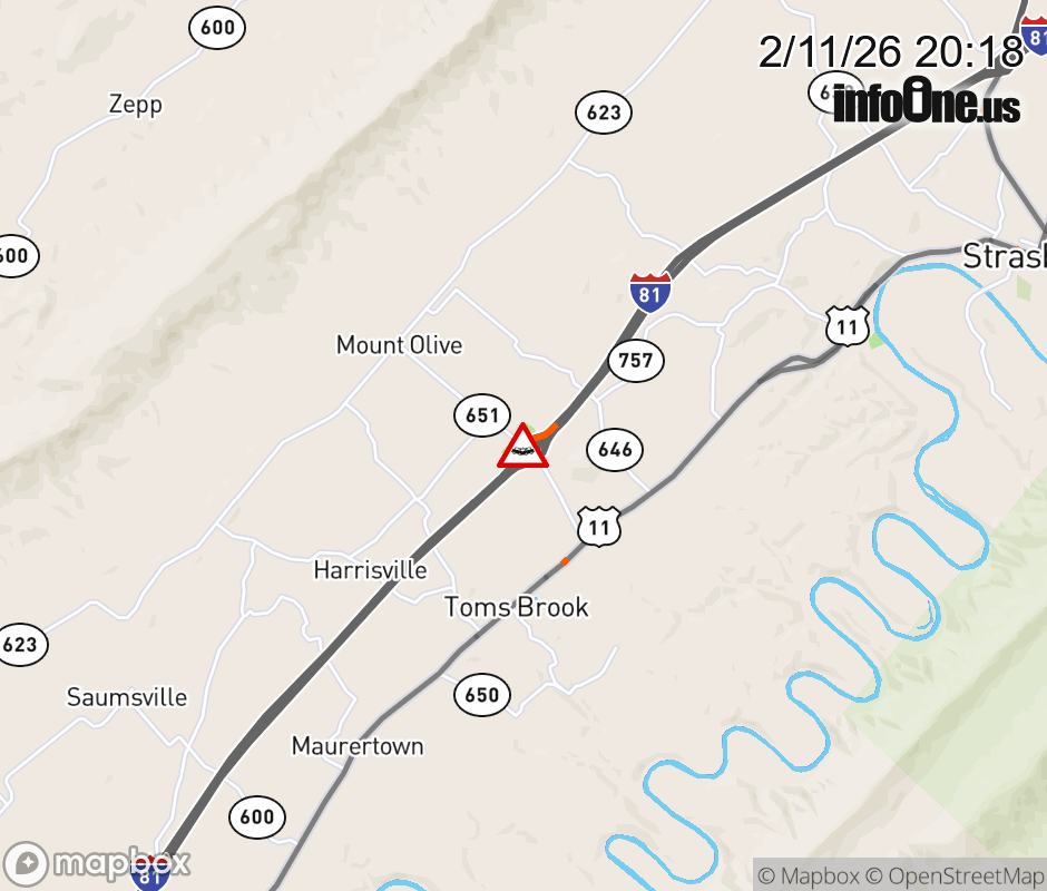 On Rt. 651 in the County of Shenandoah, in the vicinity of the ramp from and to I-81S, motorists can expect delays due to a vehicle crash. The north left shoulder is closed. Updated: Wed 2/11/26 8:18 PM EST ![]() Updated: Wed 2/11/26 8:18 PM EST |