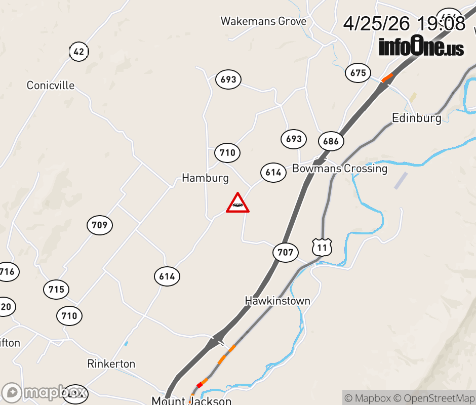 On Rt. 614 in the County of Shenandoah, in the vicinity of Belgravia Rd; Rt. 707N/S (Shenandoah County), motorists can expect delays due to a vehicle crash. All north lanes are closed. All south lanes are closed. Updated: Sat 4/25/26 7:08 PM EDT ![]() Updated: Sat 4/25/26 7:08 PM EDT |