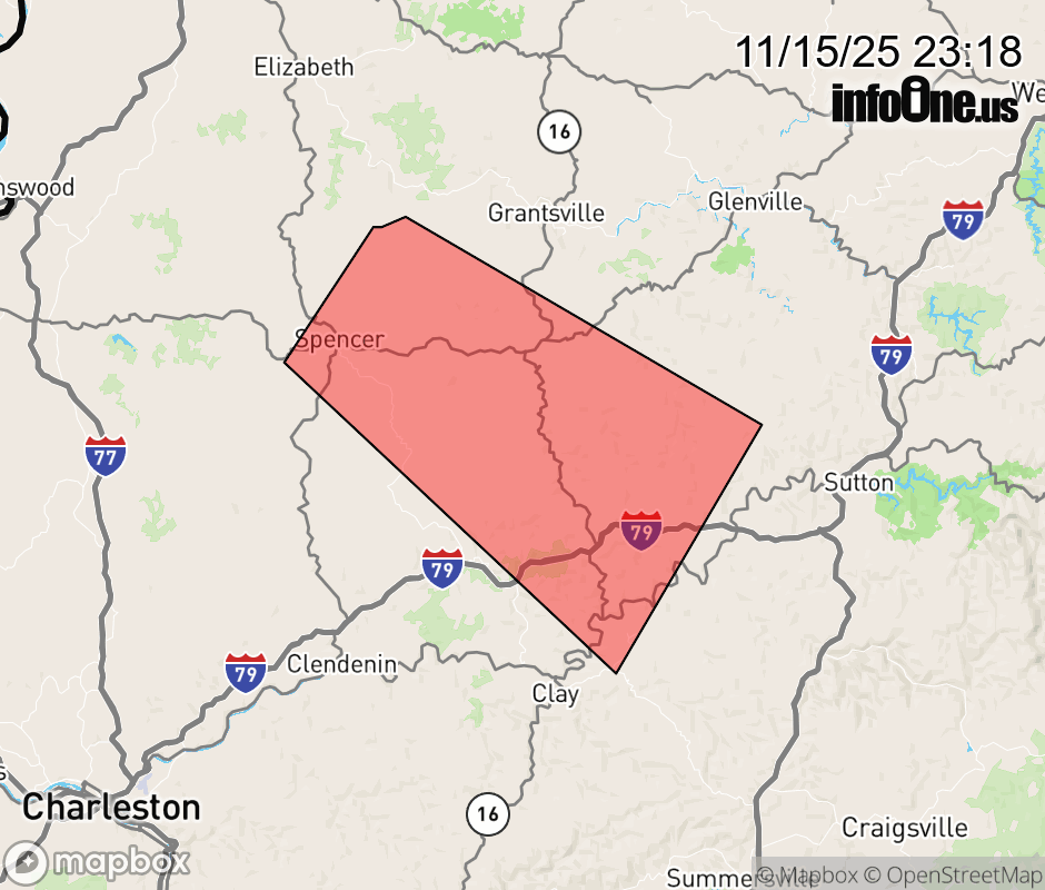 Canceled 11/15/25 11:30 PM Special Weather Statement issued November 15 at 11:13PM EST by NWS Charleston WV At 1113 PM EST, Doppler radar was tracking a strong thunderstorm near Spencer, moving southeast at 30 mph. HAZARD...Wind gusts up to 50 mph. SOURCE...Radar indicated. IMPACT...Gusty winds could knock down tree limbs and blow around unsecured objects. Locations impacted include... Spencer, Arnoldsburg, Big Otter, Wallback, Nebo, Shock, Millstone, Wilsie, Tariff, Servia, Rosedale, Orma, Ivydale, Nicut, and Chloe. This includes Interstate 79 between mile markers 35 and 48. ![]() |