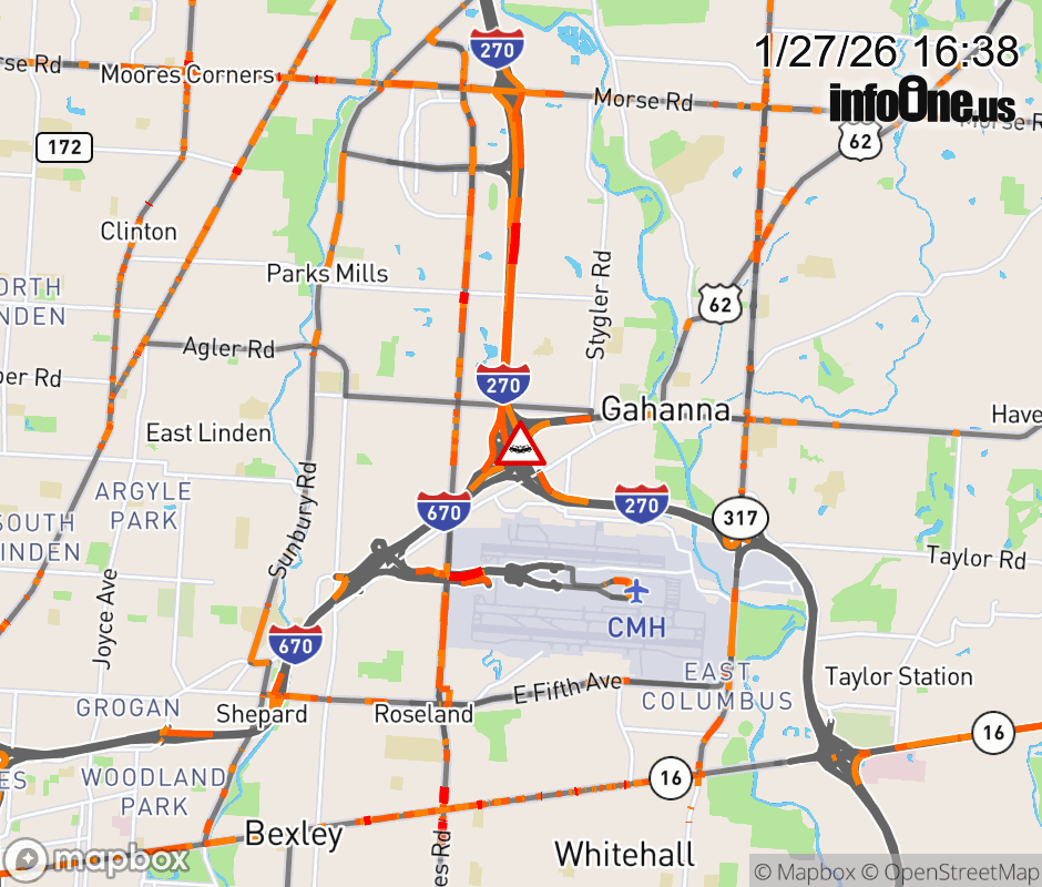 Expect lane closures on Ramp I-670/US-62 East to I-270 North/Easton Way, due to a crash. ![]() |
