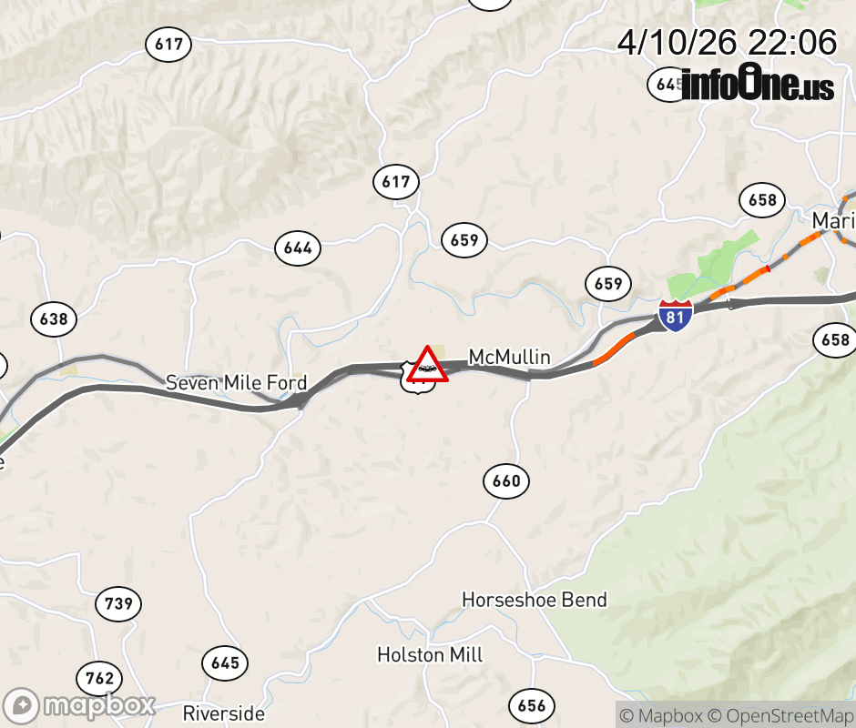 On I-81 at mile marker 40.7 in the County of Smyth, motorists can expect delays due to a vehicle crash. The south right shoulder is closed. Updated: Fri 4/10/26 10:06 PM EDT ![]() Updated: Fri 4/10/26 10:06 PM EDT |