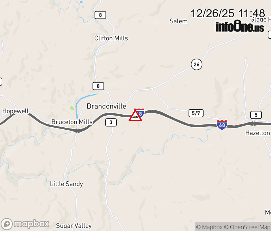 Disabled Vehicle on I-68E at Mile Marker 25.0. Updated: Fri 12/26/25 11:48 AM EST ![]() Updated: Fri 12/26/25 11:48 AM EST |