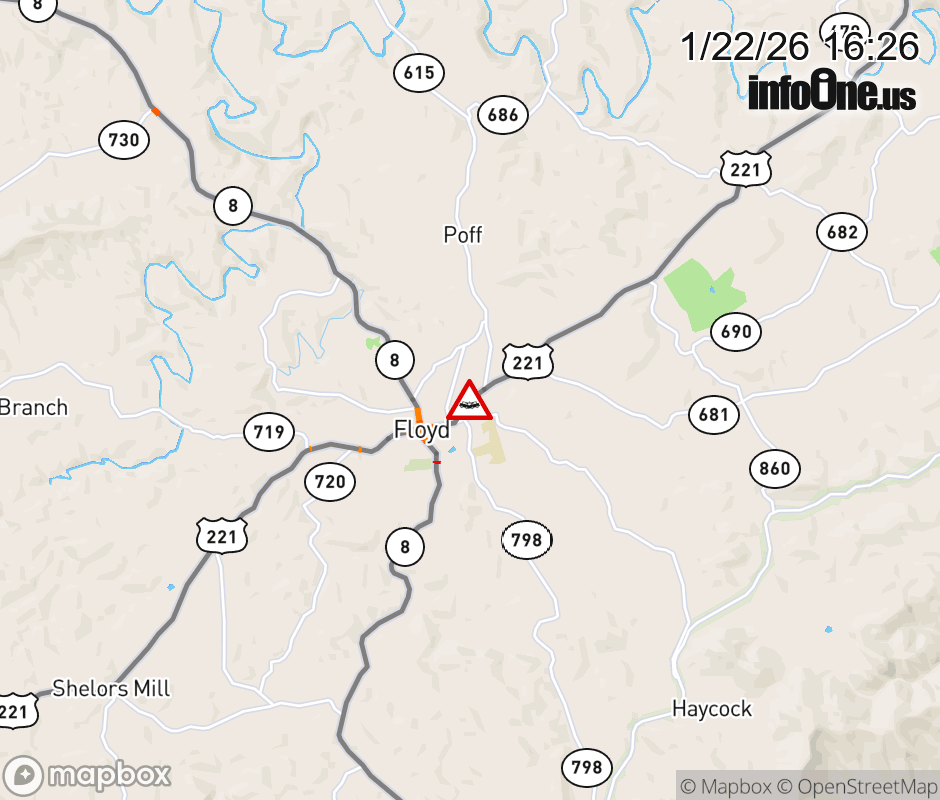 On US-221 North in the County of Floyd, in the vicinity of Clearview Dr NE; Rt. 1010N/S (Floyd County); County/City/Town Line: FLOYD, motorists can expect delays due to a vehicle crash. Lane closures exist. ![]() |