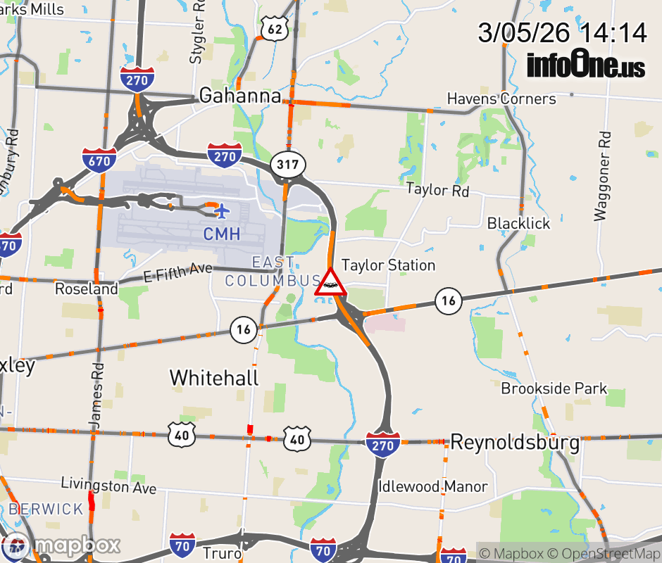 The left shoulder is blocked on I-270 South at SR-16/ Broad St, due to a crash. Updated: Thu 3/5/26 2:14 PM EST ![]() Updated: Thu 3/5/26 2:14 PM EST |