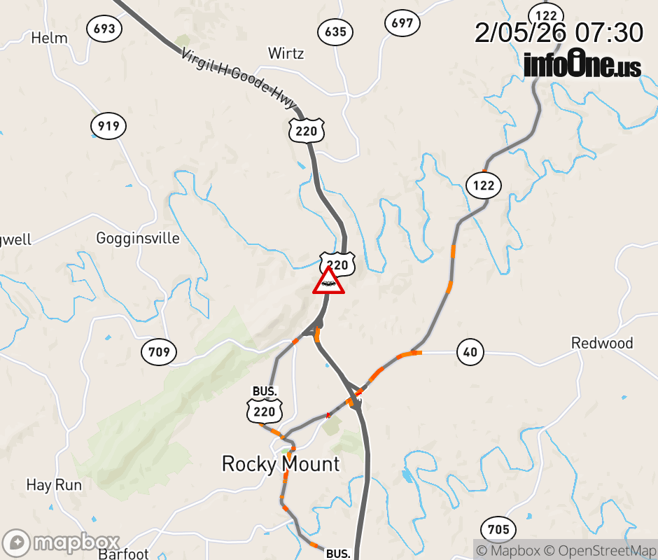 On US-220 in the County of Franklin, in the vicinity of Redbud Hill Rd; Rt. 956E/W (Franklin County), motorists can expect delays due to a tractor trailer crash. The south right lane and right shoulder are closed. ![]() |