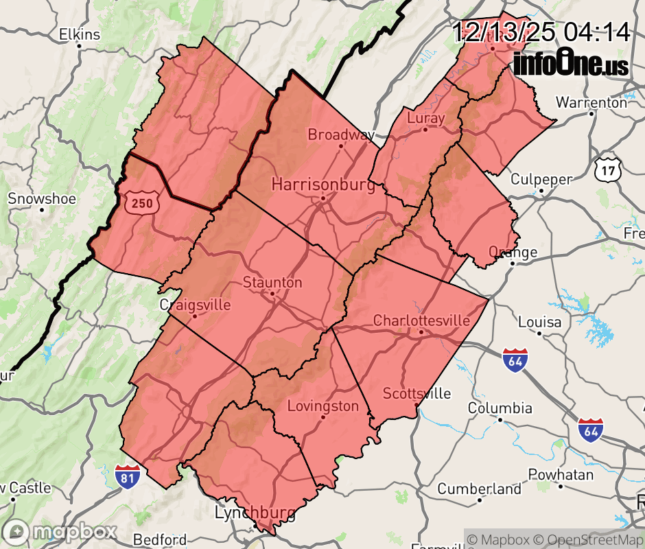 Canceled 12/13/25 7:55 AM Cold Weather Advisory issued December 13 at 4:09AM EST until December 15 at 1:00AM EST by NWS Baltimore MD/Washington DC * WHAT... Very cold wind chills as low as 13 below expected. * WHERE... In Virginia, Central Virginia Blue Ridge and Northern Virginia Blue Ridge, and Eastern Highland County. In West Virginia, Eastern Pendleton County. * WHEN... From 1 PM Sunday to 1 AM EST Monday. * IMPACTS... The cold wind chills as low as 15 below zero could result in hypothermia if precautions are not taken. ![]() |
