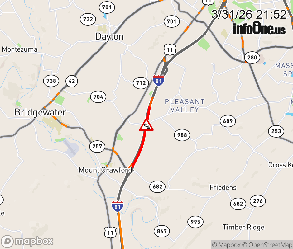 On I-81 North at mile marker 241.5 in the County of Rockingham, motorists can expect delays due to congestion. Traffic backups are approximately 1.5 miles. Updated: Tue 3/31/26 9:52 PM EDT ![]() Updated: Tue 3/31/26 9:52 PM EDT |