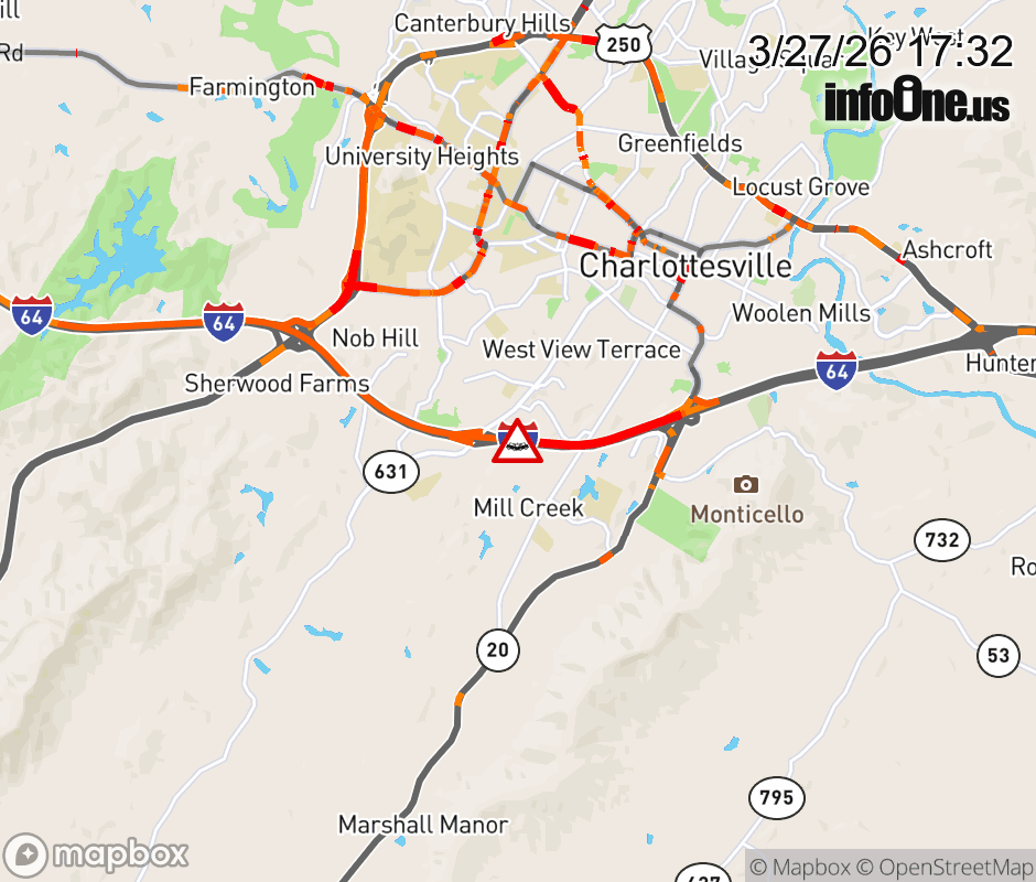 On I-64 at mile marker 120.3 in the County of Albemarle, motorists can expect delays due to a vehicle crash. The west exit ramp narrows. Updated: Fri 3/27/26 5:32 PM EDT ![]() Updated: Fri 3/27/26 5:32 PM EDT |