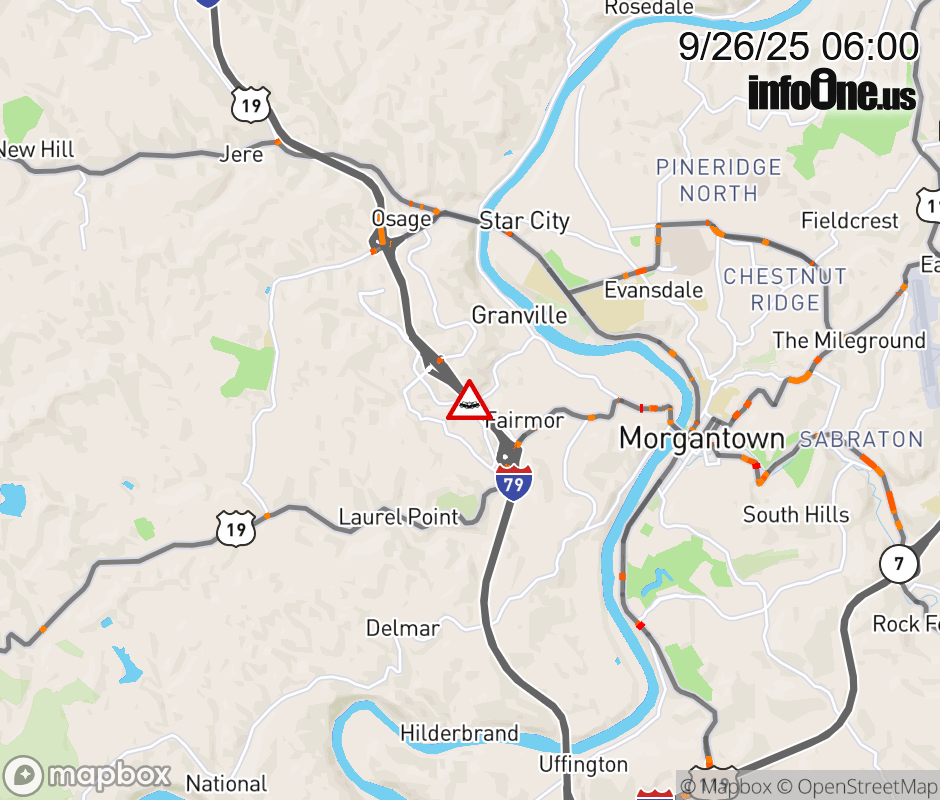 In Monongalia County there is a Vehicle Crash on I-79N at Mile Marker 153. MM 153. Current lanes impacted: LEFT LANE. Updated: Fri 9/26/25 5:52 AM EDT ![]() Updated: Fri 9/26/25 6:00 AM EDT |