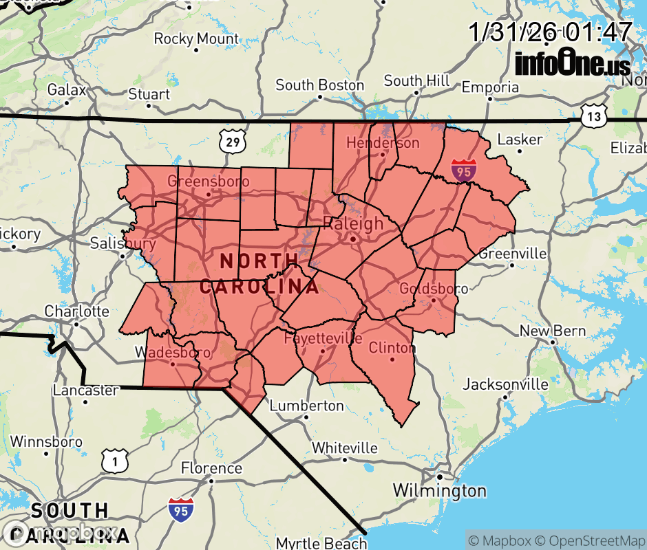 Canceled 1/31/26 3:21 PM Cold Weather Advisory issued January 31 at 1:45AM EST until February 1 at 1:00AM EST by NWS Raleigh NC * WHAT... For the Cold Weather Advisory, very cold wind chills as low as zero. For the Extreme Cold Warning, dangerously cold wind chills as low as 5 below expected. * WHERE... All of central North Carolina. * WHEN... For the Cold Weather Advisory, until 1 AM EST Sunday. For the Extreme Cold Warning, from 1 AM to 10 AM EST Sunday. * IMPACTS... Frostbite and hypothermia will occur if unprotected skin is exposed to these temperatures. An extended period of freezing temperatures could cause ruptured water pipes. ![]() |