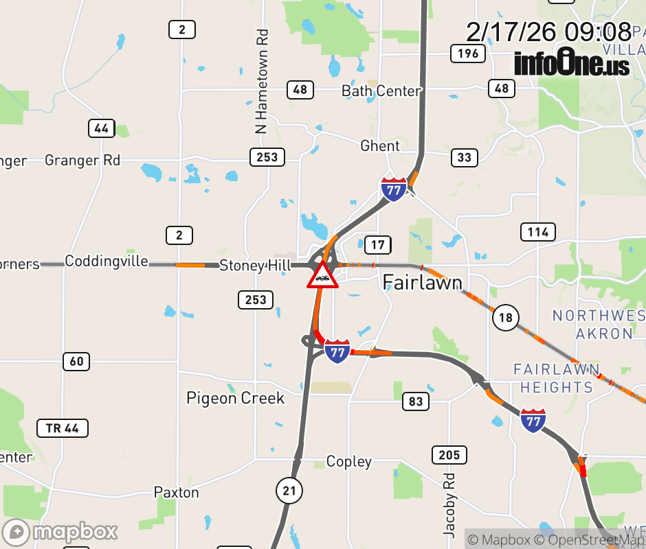 The left lane is blocked on I-77 North at SR-18 East, due to a disabled vehicle. Updated: Tue 2/17/26 9:08 AM EST ![]() Updated: Tue 2/17/26 9:08 AM EST |