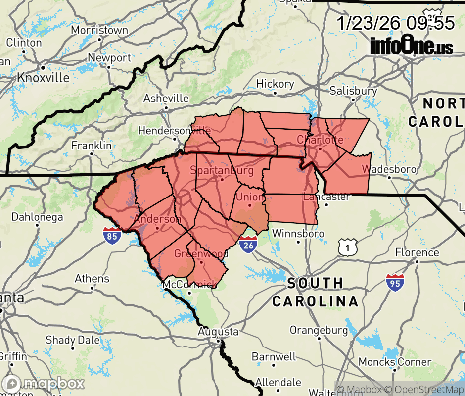 Canceled 1/23/26 10:28 AM Ice Storm Warning issued January 23 at 9:53AM EST until January 26 at 1:00PM EST by NWS Greenville-Spartanburg SC * WHAT... Significant icing, with additional impacts from accumulating sleet expected. Total snow and sleet accumulations up to two inches and ice accumulations between four tenths and three quarters of an inch. * WHERE... Upstate South Carolina and the southern foothills and Piedmont of North Carolina, including Charlotte. * WHEN... From 1 PM Saturday to 1 PM EST Monday. * IMPACTS... Ice and snow covered roadways will become treacherous and impassable. Widespread power outages are likely due to the weight of the ice and snow on tree limbs and power lines. The outages could last for days in some areas. The hazardous conditions could impact the Monday morning commute. * ADDITIONAL DETAILS... Ice accumulation will develop Saturday afternoon and evening but will increase more rapidly on Sunday, tapering off early Monday morning. ![]() |