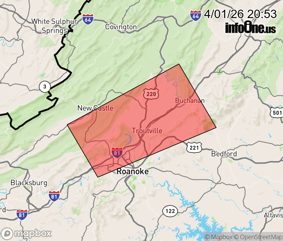Canceled 4/1/26 9:15 PM Special Weather Statement issued April 1 at 8:51PM EDT by NWS Blacksburg VA At 851 PM EDT, Doppler radar was tracking a strong thunderstorm near Hollins, or near Catawba, moving northeast at 35 mph. HAZARD...Wind gusts up to 40 mph and nickel size hail. SOURCE...Radar indicated. IMPACT...Gusty winds could knock down tree limbs and blow around unsecured objects. Minor hail damage to vegetation is possible. Locations impacted include... Roanoke... Salem... Buchanan... Troutville... Montvale... Catawba... and Eagle Rock. ![]() |