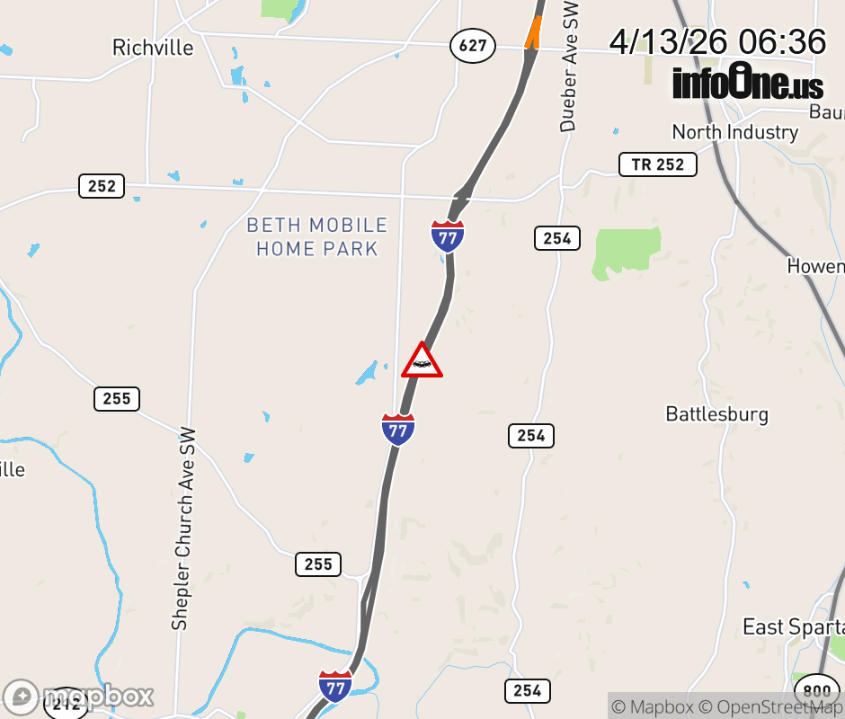 Expect lane closures on I-77 North beyond SR-212/Bolivar/Zoar, due to a crash. ![]() |